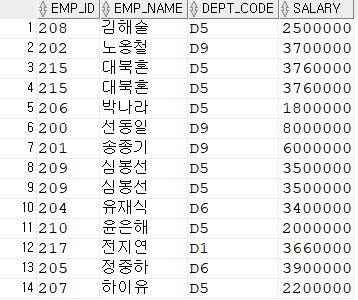 WHERE SALARY > 3000000; -- 8개행 (선동일, 송중기, 노옹철, 유재식, 정중하, 심봉선, 대북혼, 전지연)