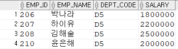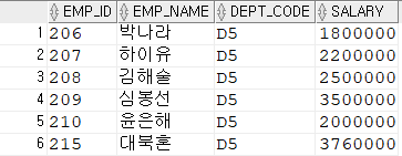 WHERE DEPT_CODE = 'D5'; --6개 행 (박나라, 하이유, 김해술, 심봉선, 윤은해, 대북혼)