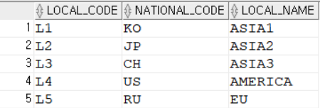 SELECT * FROM LOCATION; -- LOCAL_CODE