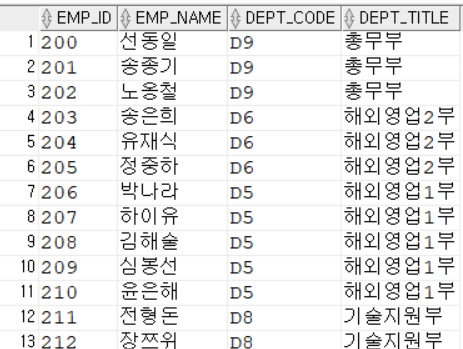 SELECT EMP_ID, EMP_NAME, DEPT_CODE, DEPT_TITLE