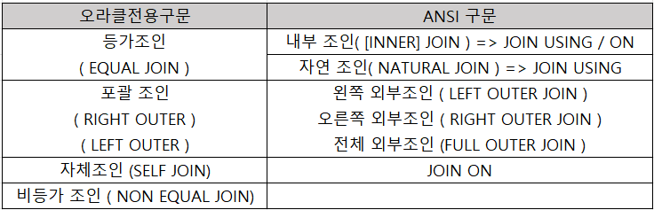 JOIN 크게 "오라클 전용구문" 과 "ANSI 구문" (ANSI == 미국국립표준협회) => 아스키코드표 만드는 단체!