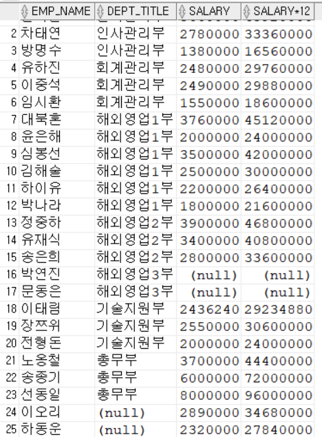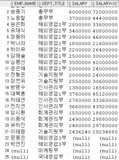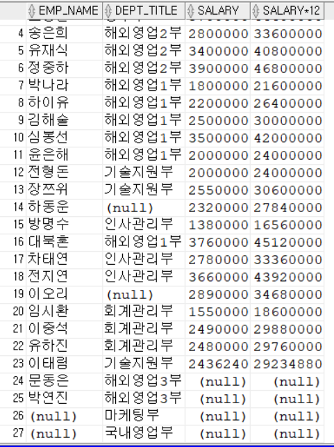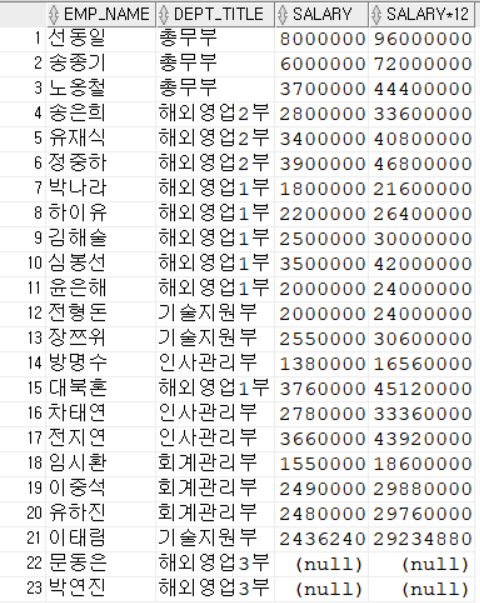 SELECT EMP_NAME, DEPT_TITLE, SALARY, SALARY * 12