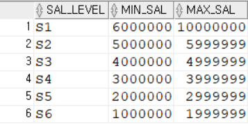 --WHERE SALARY >= MIN_SAL AND SALARY <= MAX_SAL;