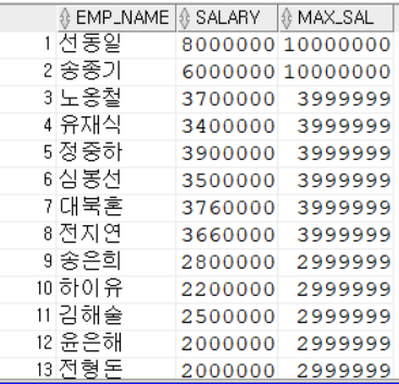 SELECT EMP_NAME, SALARY, MAX_SAL
