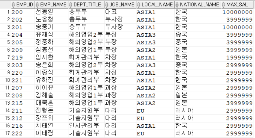 SELECT EMP_ID, EMP_NAME, DEPT_TITLE, JOB_NAME, LOCAL_NAME, NATIONAL_NAME, MAX_SAL
