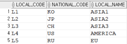 SELECT * FROM LOCATION; -- LOCAL_CODE NATIONAL_CODE
