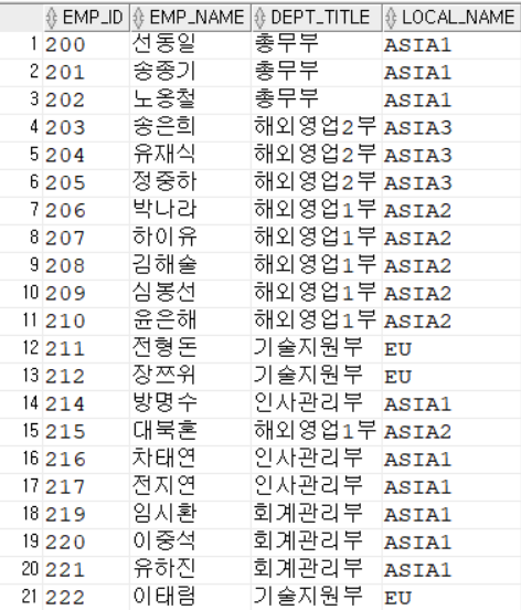SELECT EMP_ID, EMP_NAME, DEPT_TITLE, LOCAL_NAME