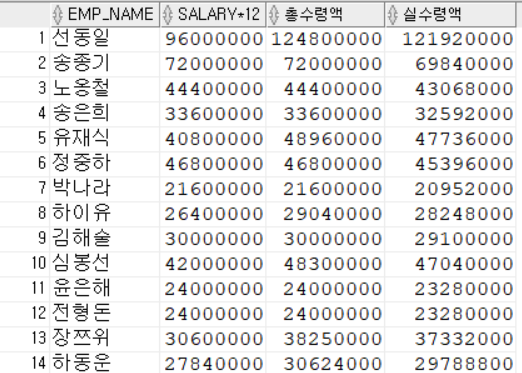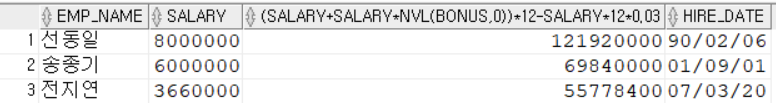 SELECT EMP_NAME, SUBSTR(EMP_NO,1,6), SUBSTR(EMP_NO,8,7), SUBSTR(EMP_NO,1,6) + SUBSTR(EMP_NO,8,7)