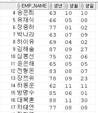 SELECT EMP_NAME, SUBSTR(EMP_NO,1,2) AS "생년", SUBSTR(EMP_NO,3,2) AS "생월", SUBSTR(EMP_NO,5,2) AS "생일"