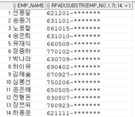 SELECT EMP_NAME, RPAD(SUBSTR(EMP_NO, 1,7),14, '*')