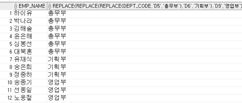 SELECT EMP_NAME, REPLACE(REPLACE(REPLACE(DEPT_CODE,'D5','총무부'),'D6','기획부'),'D9','영업부')