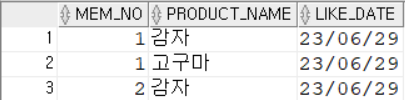 INSERT INTO TB_LIKE VALUES(2, '감자', SYSDATE); -- 2번 회원이 감자 찜