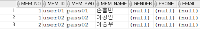 PRIMARY KEY(MEM_NO, MEM_ID) -- 묶어서 PRIMARY KEY 제약 조건 부여(복합키)