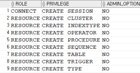 RESOURCE : 특정 객체들을 생성할 수 있는 권한 CREATE TABLE, CREATE SEQUENCE...