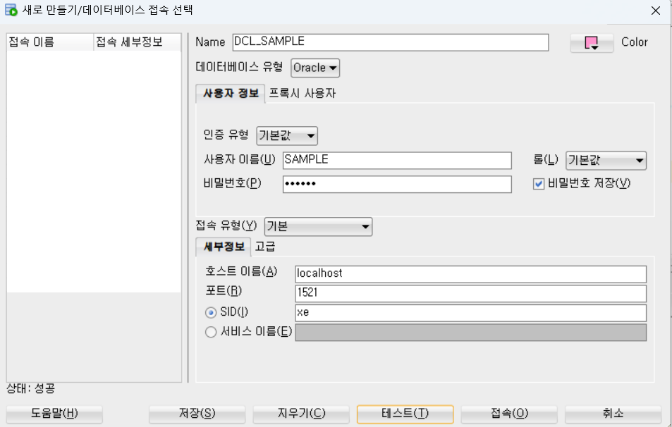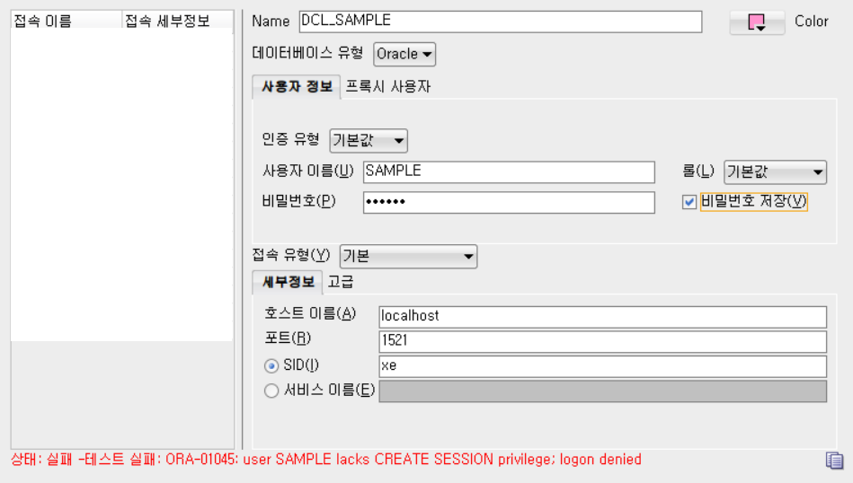 -- 상태: 실패 -테스트 실패: ORA-01045: user SAMPLE lacks CREATE SESSION privilege; logon denied