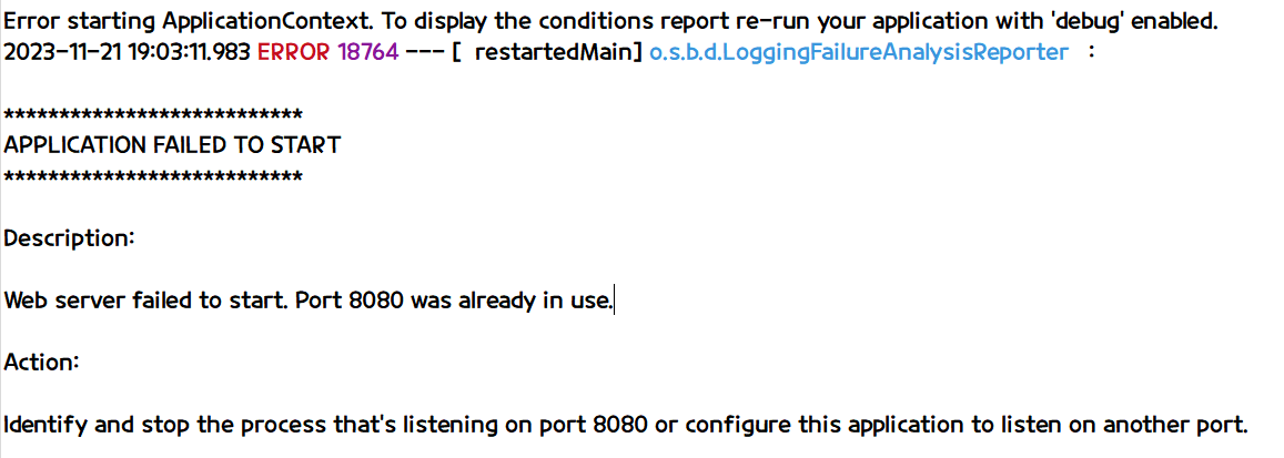 혹시 이 오류가 뜬다면 이 서버를 구동할때 8080포트를 사용하는데 다른곳에서 이미 사용중이라 쓸 수 없다는 뜻이다.