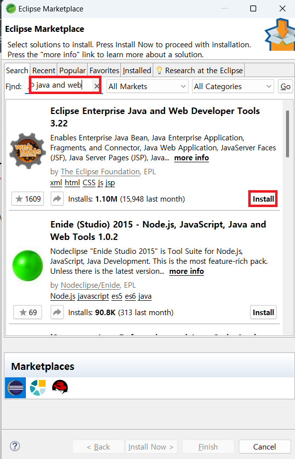 STS툴 상단의 Help - Eclipse Marketplace 클릭 java and web을 검색후 install 툴 하단의 설치바가 사라질때까지 얌전히 기다린다 재시작 설치가 잘 됐다!! 공유하기 게시글 관리 종이의 코딩 공부방