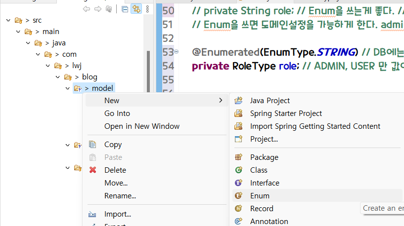 com/lwj/blog/model 에 enum을 생성해준다. 파일명은 RoleType