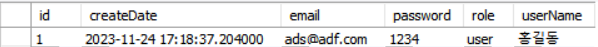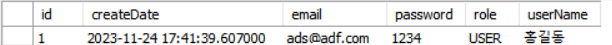 (createDate, email, password, userName) #insert 할때 role 값이 없어야한다.