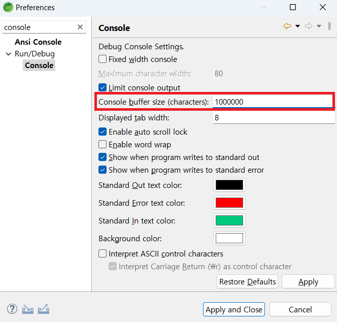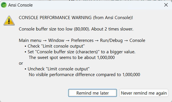 STS를 실행 중 아래와 같은 경고가 발생했다. 이 알림창은 콘솔에 출력하는 출력 라인 크기를 조절하라는 얘기다. 해결방법 Window - preferences - console 버퍼사이즈를 증가시킨다. 800,000에서 1,000,000으로 변경했다. 공유하기 게시글 관리 종이의 코딩 공부방