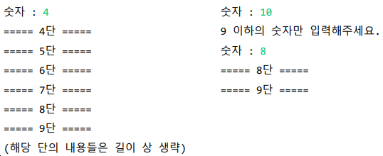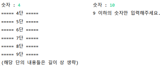 위 문제와 모든 것이 동일하나, 9를 초과하는 숫자가 입력됐다면 “9 이하의 숫자를 입력해주세요”가 출력되면서 다시 사용자가 값을 입력하도록 하세요.