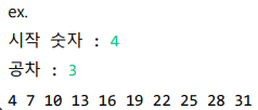 사용자로부터 시작 숫자와 공차를 입력 받아 일정한 값으로 숫자가 커지거나 작아지는 프로그램을 구현하세요. 단, 출력되는 숫자는 총 10개입니다
