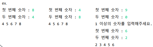 사용자로부터 두 개의 값을 입력 받아 그 사이의 숫자를 모두 출력하세요. 만일 1 미만의 숫자가 입력됐다면 “1 이상의 숫자를 입력해주세요“를 출력하세요.