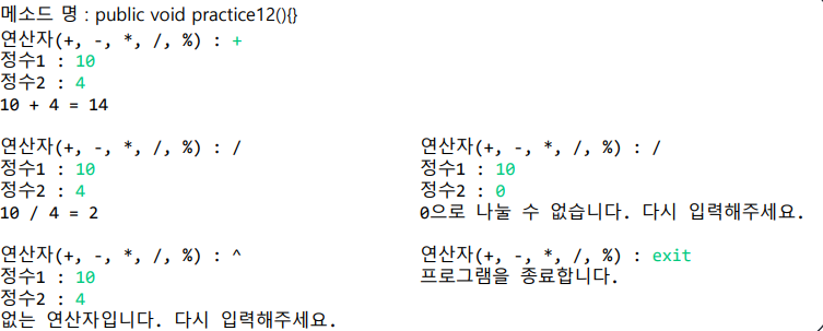 정수 두 개와 연산자를 입력 받고 입력된 연산자에 따라 알맞은 결과를 출력하세요. 단, 해당 프로그램은 연산자 입력에 “exit”라는 값이 들어올 때까지 무한 반복하며 exit가 들어오면 “프로그램을 종료합니다.”를 출력하고 종료합니다. 또한 연산자가 나누기이면서 두 번째 정수가 0으로 들어오면 “0으로 나눌 수 없습니다. 다시 입력해주세요.”를 출력하며, 없는 연산자가 들어올 시 “없는 연산자입니다. 다시 입력해주세요.”라고 출력하고 두 경우 모두 처음으로 돌아가 사용자가 다시 연산자부터 입력하도록 하세요.