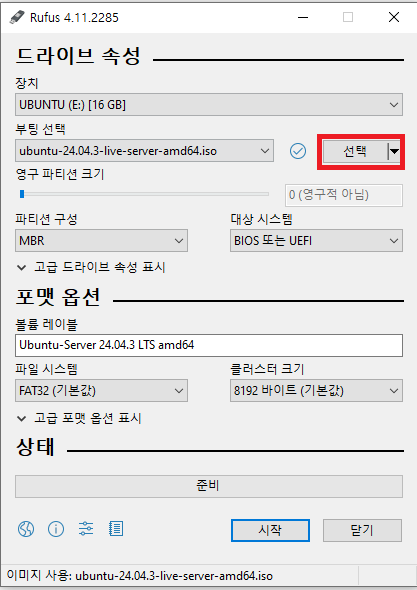 선택 버튼 클릭 → 아까 받은 Ubuntu Server ISO 파일 선택