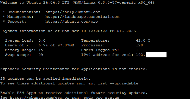 현재 상태에서는 같은 공유기 환경(내부망)에서만 원격으로 접속이 가능하며, 외부(예: 카페, 회사 등)에서는 접속할 수 없다. 다음 게시글에서는 외부 PC에서 SSH로 접속할 수 있도록 설정하는 방법을 다룰 예정이다.