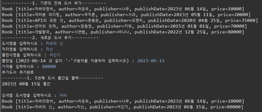 System.out.println("---------3. 5번째 도서 출간일 출력---------");