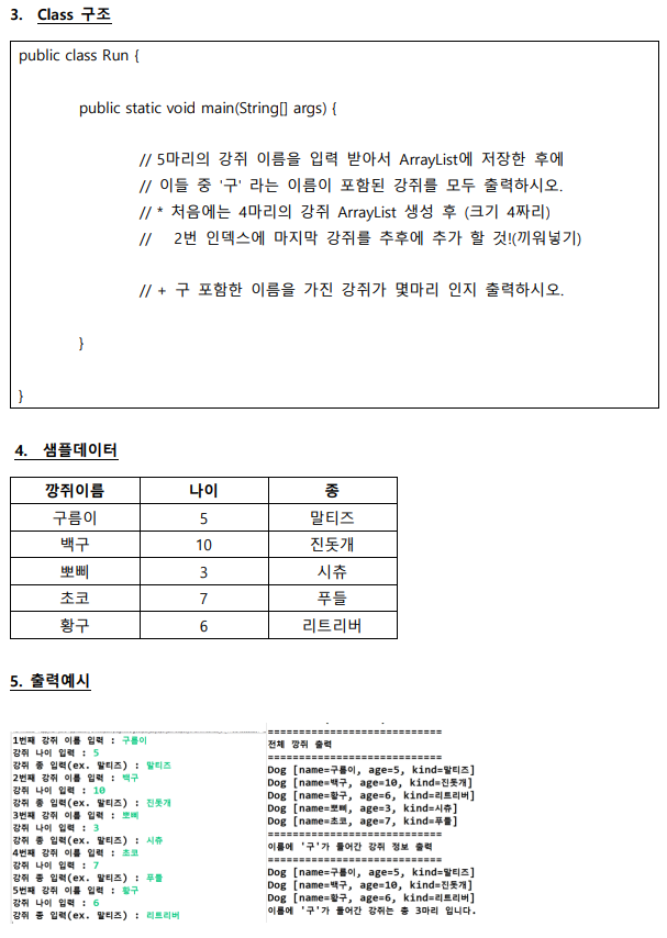 // 5마리의 강쥐 이름을 입력 받아서 ArrayList에 저장한 후에