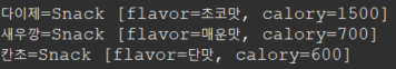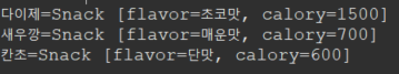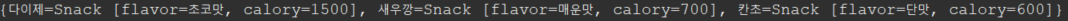 return "Snack [flavor=" + flavor + ", calory=" + calory + "]";