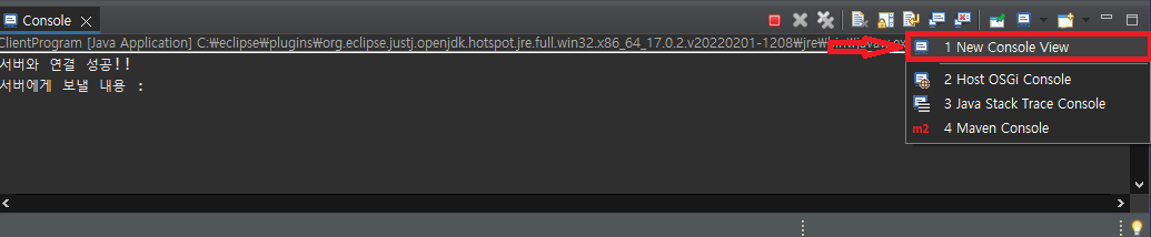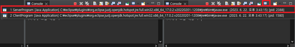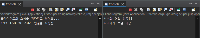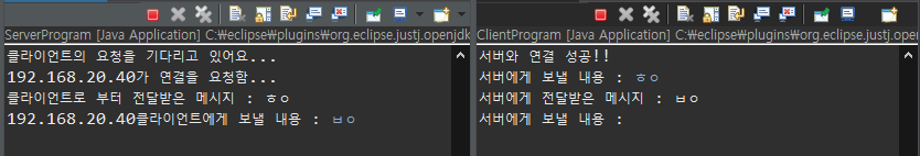 먼저 ServerProgram을 실행 한 후 이어서 ClientProgram을 실행한다.