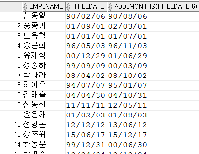 SELECT EMP_NAME, HIRE_DATE, ADD_MONTHS(HIRE_DATE, 6)