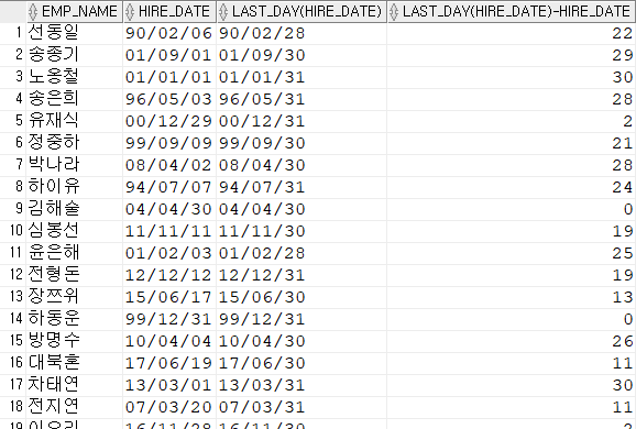 SELECT EMP_NAME, HIRE_DATE, LAST_DAY(HIRE_DATE), LAST_DAY(HIRE_DATE) - HIRE_DATE