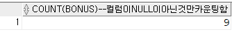 SELECT COUNT(BONUS) -- 컬럼이 NULL이 아닌것만 카운팅함