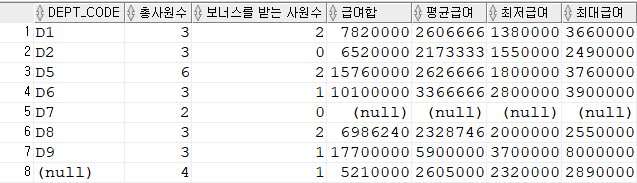 SELECT DEPT_CODE, COUNT(*) AS "총사원수", COUNT(BONUS) AS "보너스를 받는 사원수",