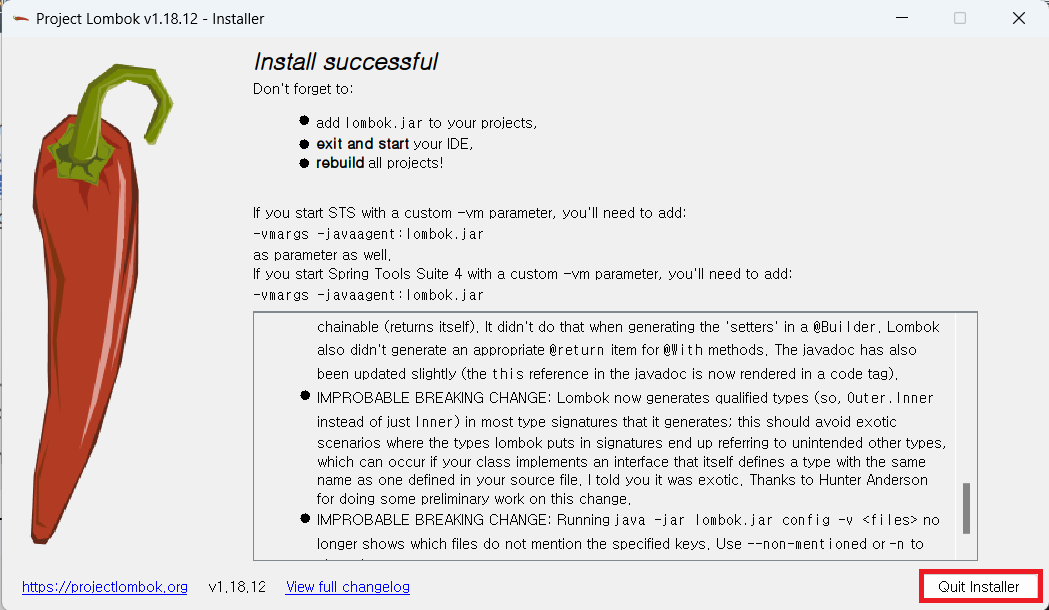 다시 프로젝트를 켜서 어노테이션으로 Getter를 치고 ctrl + space 를 했을때, 상단에 import lombok.Getter 가 생기면 성공!!