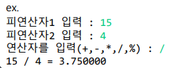 System.out.print("연산자를 입력(+,-,*,/,%) : ");