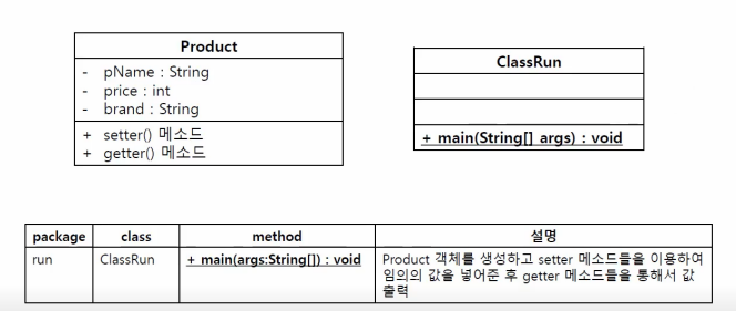 예제) 아래의 클래스 다이어그램을 보고 클래스를 작성하세요.