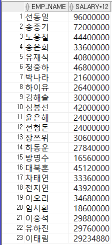 SELECT 절 컬럼명 작성 부분에 산술연산 기술 가능 (이때, 산술연산된 결과 조회)
