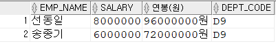 SELECT EMP_NAME, SALARY, SALARY * 12 || '원' AS "연봉(원)" , DEPT_CODE