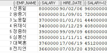 SELECT EMP_NAME, SALARY, HIRE_DATE, SALARY * 12