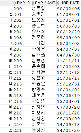 SELECT EMP_ID, EMP_NAME, HIRE_DATE