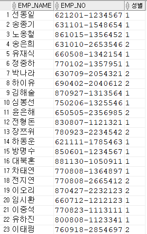 SELECT EMP_NAME, EMP_NO, SUBSTR(EMP_NO, 8, 1) AS "성별"