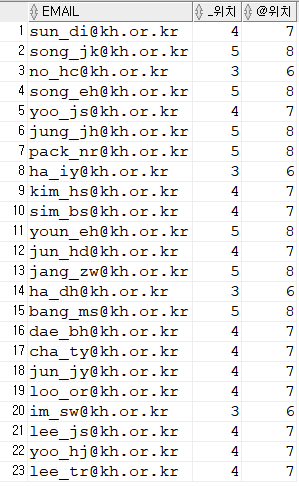 SELECT EMAIL, INSTR(EMAIL, '_', 1, 1) AS "_위치", INSTR(EMAIL, '@') AS "@위치"