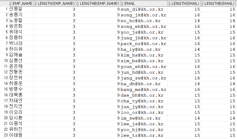 SELECT EMP_NAME, LENGTH(EMP_NAME), LENGTHB(EMP_NAME),